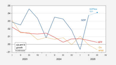 Here’s a picture of household net worth, in both nominal and real terms, with my nowcasts for Q3.