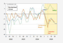 Figure 1: EPU (green, right scale), 7 day centered moving average Economic Policy Uncertainty (brown, right scale), Trade Policy Uncertainty (green, left scale), 7 day centered moving average EPU (red, left scale). Source: policyuncertainty.com, matteoiacoviello.com.