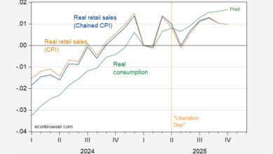 My current growth forecast (red triangle) is the same as what I penciled back in December; in other words, I thought the Trump policies would be as bad as they turned out to be (at least with respect to economic policy). I based the forecast on subtracting the McKibben et al. estimates from pre-Trump baseline.
