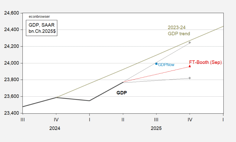 FIgure 1: GDP (bold black), FT-Booth September survey median (red triangle), 10/90 percentile interval (gray +), GDPNow of 9/1 (light blue square), and 2023-24 trend (chartreuse), all in bn.Ch.2017$ SAAR. Source: BEA 2025q2 3rd release/annual benchmark revision, FT-Booth Seeptember survey, Atlanta Fed, and author’s calculations.