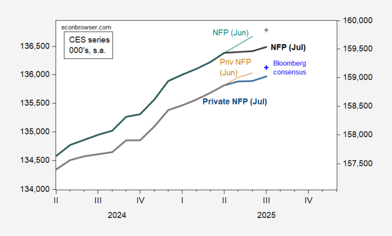 Figure 1: Nonfarm Payroll Employment, July release (bold black, right log scale), implied Bloomberg consensus (gray +, right log scale), June release (teal, right log scale), Private NFP, July release (blue, left hand log scale), implied Bloomberg consensus (blue +, left hand log scale), June release (tan, left hand log scale), all in 000’s, s.a. Implied Bloomberg estimates calculated by iterating consensus change on top of June release figures. Source: BLS, Bloomberg, and author’s calculations.