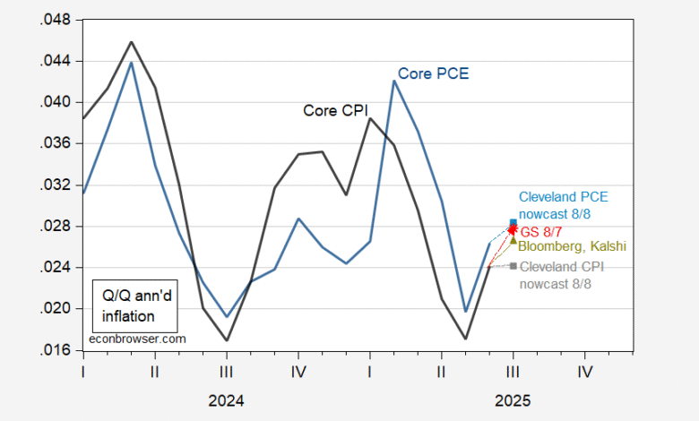 Figure 1: Quarter-on-Quarter annualized inflation of CPI (bold black), Cleveland Fed nowcast as of 8/8 (gray square), Bloomberg consensus, Kalshi betting CT (chartreuse triangle), Goldman Sachs as of 8/7 (red *), inflation of PCE (bold blue), Cleveland Fed nowcast as of 88 (light blue square). Source: BLS, BEA, Cleveland Fed accessed 8/8, Bloomberg, Kalshi accessed 8/8 noon CT, Goldman Sachs, and author’s calculations.