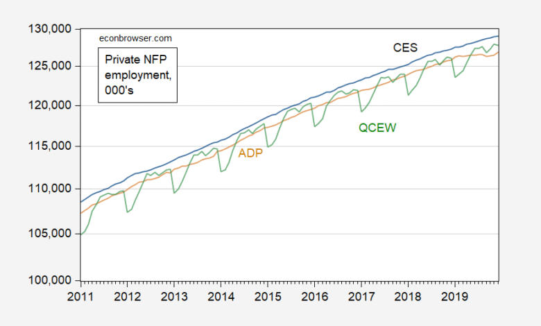 FInally, a point that applies generally: private agents have their own agendas for compiling data. ADP has data as a byproduct of its activities. But it doesn’t have as an objective tracking the entire labor market, just the private nonfarm labor market that it services. And, who has an interest in compiling accurately the number of people employed (as opposed to number of jobs). That’s collected by the CPS, but I don’t see who naturally would step into the breach.