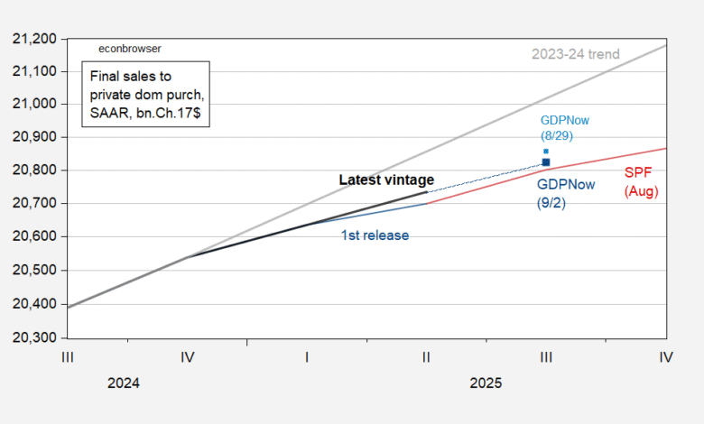 Figure 1: Final sales to private domestic purchasers, latest vintage (bold black), advance release (blue), GDPNow of 8/29 (light blue square), GDPNow of 9/2 (dark blue square), Survey of Professional Forecasters August median (dark red), 2023-24 stochastic trend (gray), all in bn.Ch.2017$ SAAR. Source: BEA, Atlanta Fed, Philadelphia Fed, and author’s calculations.