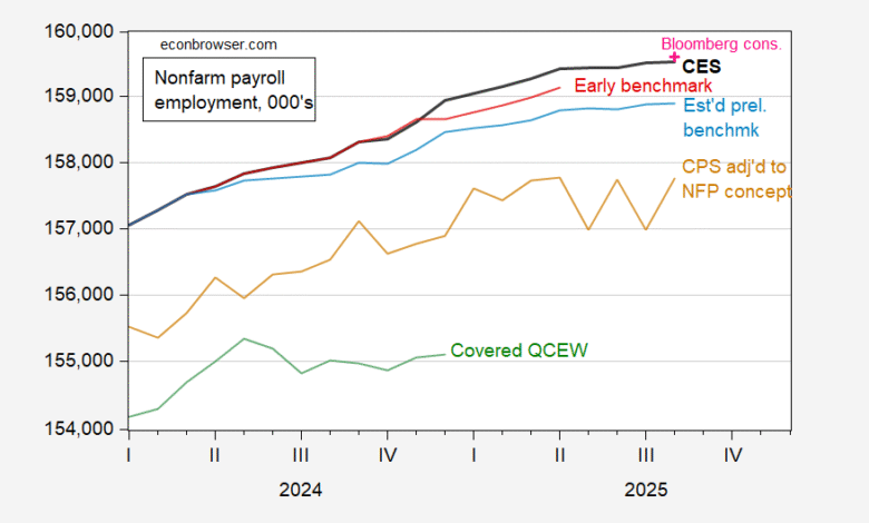 Figure 1: Nonfarm payroll employment from CES (bold black), Bloomberg consensus estimate (pink +), estimated preliminary benchmark revision based on Wells Fargo estimate (light blue), CPS data adjusted to NFP concept (tan), and covered QCEW employment, seasonally adjusted by author using X-13 (green), all in 000’s. Estimated preliminary benchmark revision using midpoint of Wells Fargo estimate of revision of -475K to -790K. Source: BLS via FRED, BLS, Bloomberg, Wells Fargo, and author’s calculations.