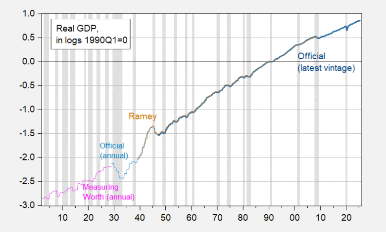Figure 1: Real GDP according to BEA (blue), Ramey series (tan), BEA annual (light blue), Measuring Worth annual (pink), all in logs 1990Q1=0. NBER defined peak to trough recession dates shaded gray. Source: BEA, Valerie Ramey, Measuring Worth, NBER< and author’s calculations.