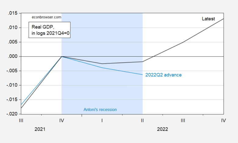 Figure 1: Real GDP from 2025Q2 2nd release (black), and  2022Q2 advance release (light blue), both in logs 2021Q4=0. EJ Antoni’s recession shaded light blue. Source: BEA via FRED, ALFRED.