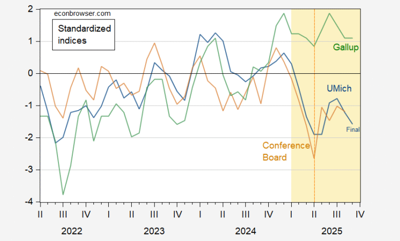 Figure 1: U.Michigan Economic Sentiment (blue), Conference Board Confidence Index (brown), Gallup Confidence (green), all demeaned and divided by standard deviation 2021M01-2025m02. Source: UMichigan, Gallup, Conference Board, and author’s calculations.