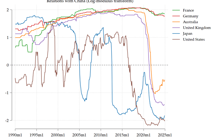 The updated data show that the relationships with China knew contrasting evolutions over the last years (2022-2024). As you can see in Figures 1 and 2, the relations of China with France and Germany have experienced some stabilization. The relationships of China with Japan and the US have known modest improvements. The relationship of China with Australia clearly improved in the recent years.