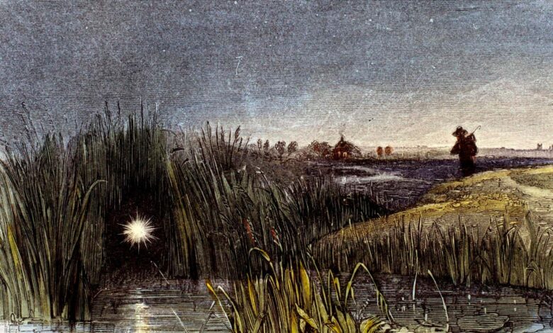In bogs, swamps and marshes, people occasionally see mysterious blue-tinged flashes of light above water, which have commonly been associated with ghosts or spirits. A more likely explanation for these will-o’-the-wisps, or ignis fatuus, is that the flashes come from the combustion of gases, like methane and phosphine, produced by decaying organic matter in the murky water below. But it is unclear what would make the gases ignite, with proposed causes such as static electricity or lightning remaining unproven.