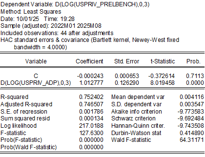 I think the answer is yes…and no. As noted by other observers, the month-on-month correlation of ADP and BLS series is low. However, the quarter-on-quarter is fairly high. A regression of BLS series on ADP series (3 month log differences) yields: