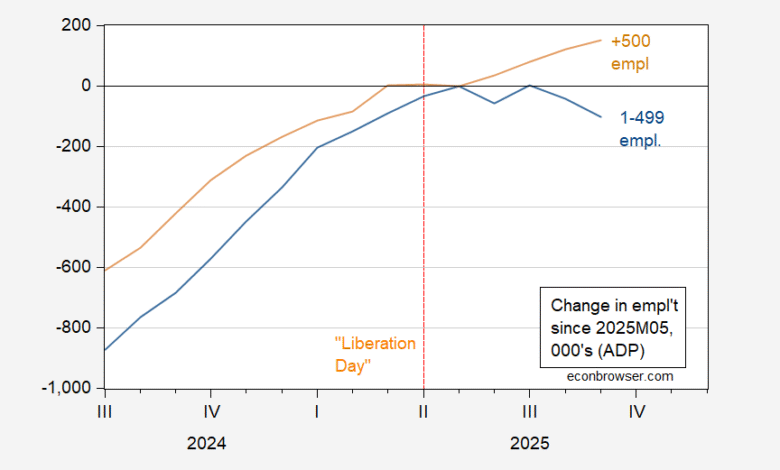 Figure 1: Change in employment from May 2025 in firms with less than 500 employees (blue), in firms with 500 and more employees (tan), both in 000’s, s.a. Source: ADP via FRED, and author’s calculations.