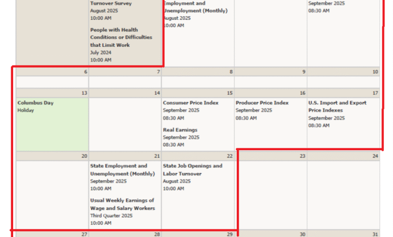 We have already missed the employment situation release. In addition, we’ll miss CPI, PPI, import and export price indices, state employment/unemployment, state JOLTS for August.