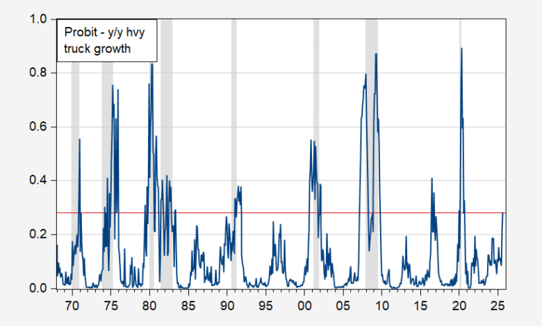 Figure 1: Estimated probability of NBER recession using probit on heavy truck sales growth (blue). Red line at current value of 0.28. NBER defined peak-to-trough recession dates shaded gray. Source: NBER, and author’s calculations.