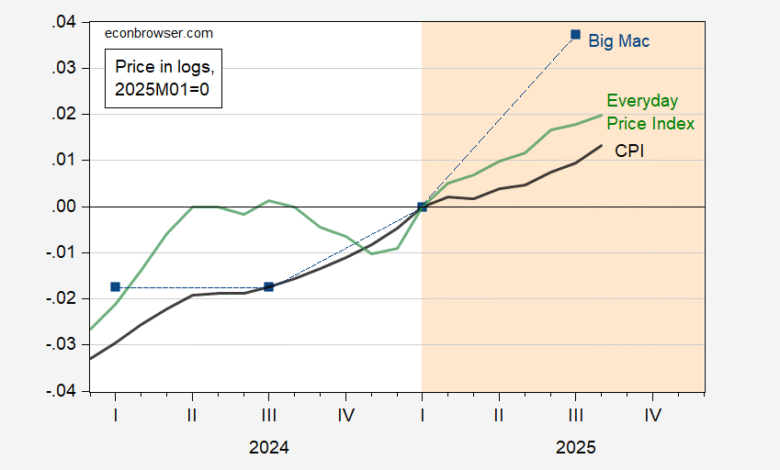 Figure 1: CPI (black), AIER Everyday Price index (green), Big Mac price (blue square), all in logs 2025M01=0. source: BLS, AIER, Economist, and author’s calculations.