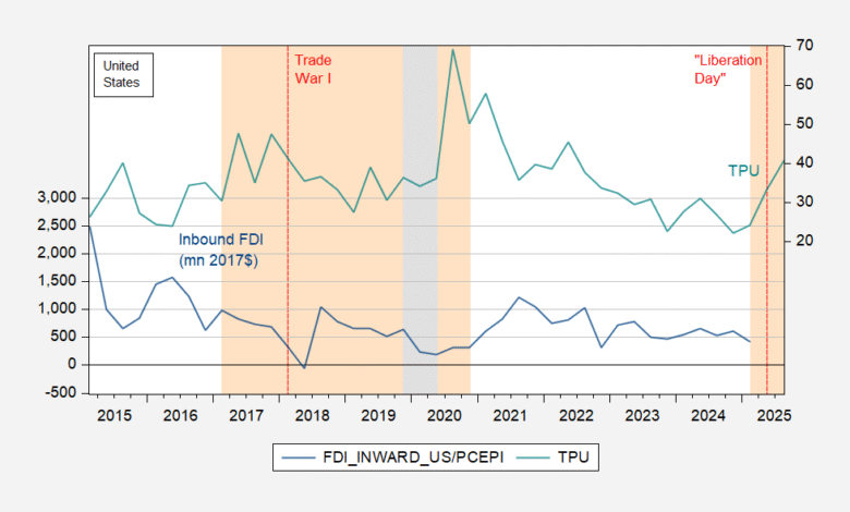 Figure 1: Inbound FDI, mn Ch.2017$ (blue, left scale), Trade Policy Uncertainty (teal, right scale). Trump administration periods shaded light orange. NBER defined peak-to-trough recession dates shaded gray. Source: OECD, BEA, matteoiacoviello.com, NBER, and author’s calculations.