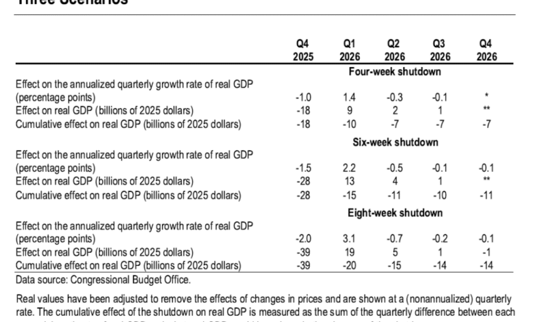 In CBO’s assessment, the shutdown will delay federal spending and have a negative effect on the economy that will mostly, but not entirely, reverse once the shutdown ends. The agency estimates that real gross domestic product (GDP), which has been adjusted to remove the effects of inflation, will be lower in the fourth quarter of 2025 than it would have been in the absence of a shutdown.2 Depending on its length, the government shutdown will reduce annualized real GDP growth in that quarter by 1.0 to 2.0 percentage points. After the shutdown, real GDP will be temporarily higher than it would have been otherwise. Although most of the decline in real GDP will be recovered eventually, CBO estimates that between $7 billion and $14 billion (in 2025 dollars) will not be.