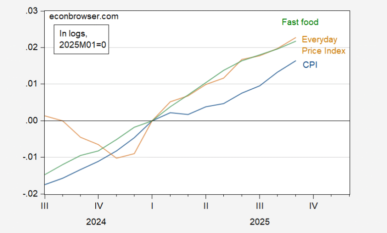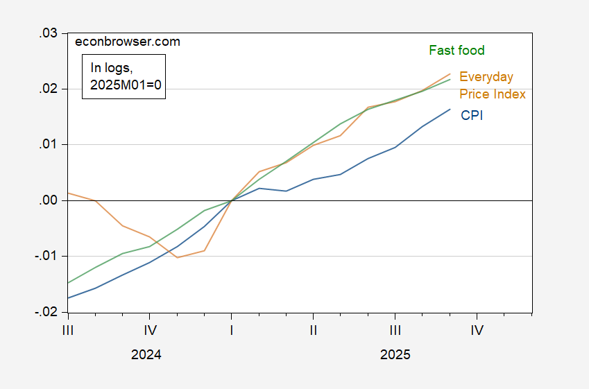 Figure 1: CPI all urban (blue), Everyday Price Index (tan), and CPI for limited service restaurants (green), all in logs, 2025M01=0. CPI for limited service restaurants seasonally adjusted by author using X-13. Source: BLS, AIER, and author’s calculations.