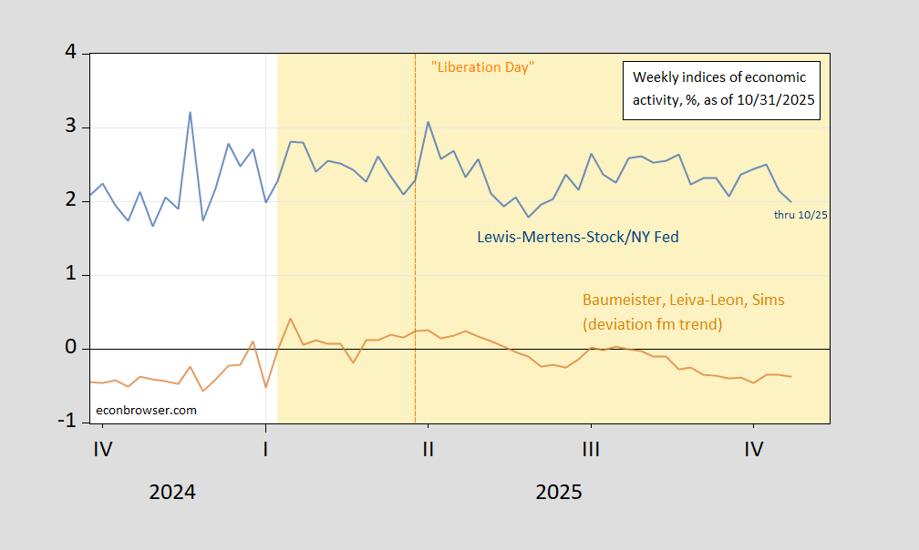Figure 1: Lewis, Mertens, Stock Weekly Economic Index (blue), and Baumeister, Leiva-Leon, Sims Weekly Economic Conditions Indicator for US (tan), all y/y growth rate in %. Source: NY Fed via FRED, WECI, accessed 10/31, and author’s calculations.