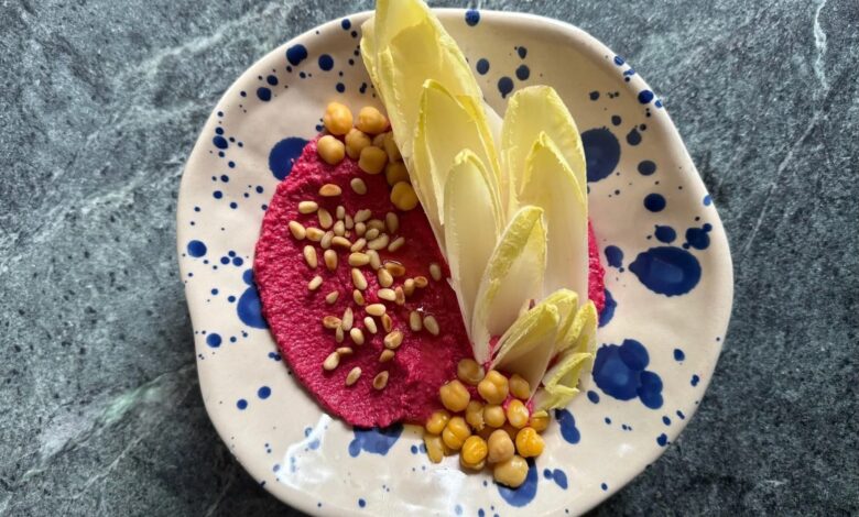 Serve, if you’d like, with pan-toasted pine nuts and the reserved chickpeas on top. For dipping, I find it goes best with endives and carrots.