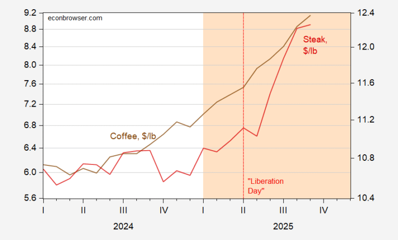 Figure 1: Average price ground coffee, $/lb. (brown, left log scale), and beef steak, $/lb. (red, right log scale). Source: BLS.
