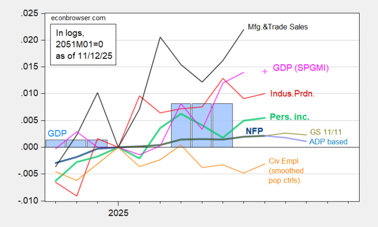 Figure 1: Implied NFP preliminary benchmark revision (bold dark blue), ADP implied NFP (light blue), Goldman Sachs implied (chartreuse), civilian employment with smoothed population controls, (bold orange), industrial production (red), personal income excluding current transfers in Ch.2017$ (bold light green), manufacturing and trade sales in Ch.2017$ (black), consumption in Ch.2017$ (light blue), and monthly GDP in Ch.2017$ (pink), extrapolated monthly GDP using Philadelphia Fed Coincident Index (pink +), GDP (blue bars), all log normalized to 2025M01=0. Source: BLS via FRED, Federal Reserve, BEA 2025Q2 third release, S&P Global Market Insights (nee Macroeconomic Advisers, IHS Markit) (9/2/2025 release), and author’s calculations.