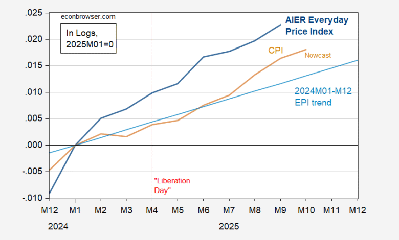 Figure 1: American Institute for Economic Research (AIER) Everday Price Index (EPI) (bold blue), 2024M01-M12 stochastic trend (light blue), and CPI all urban (tan), all in logs, 2025M01=0. October CPI observation is Cleveland Fed nowcast. Source: AIER, BLS, Cleveland Fed (accessed 11/11) and author’s calculations.