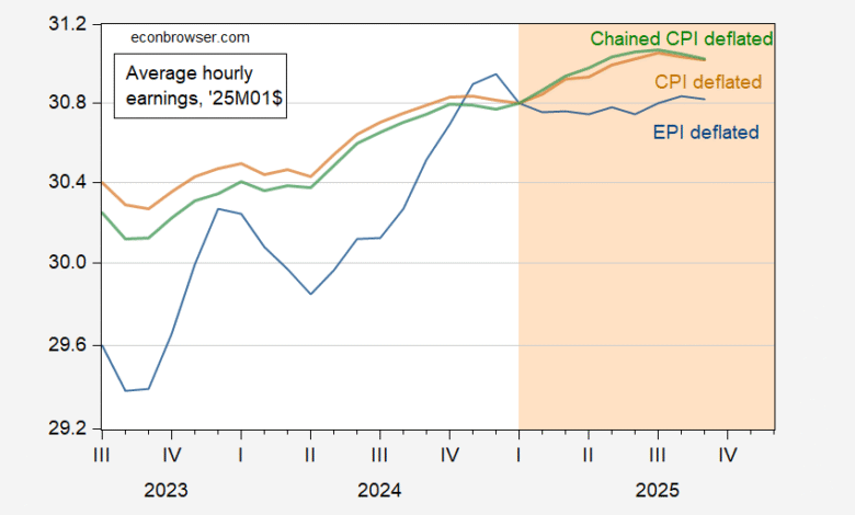 Figure 1: Average hourly earnings of production and nonsupervisory workers, using CPI (brown), chained CPI (green), and AIER Everday Price Index (blue), all in 2025M01$. Chained CPI seasonally adjusted by author using X-13 in logs. Source: BLS via FRED, American Institute for Economic Research, and author’s calculations.