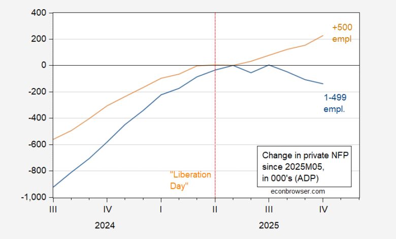 Figure 1: Change in employment from May 2025 in firms with less than 500 employees (blue), in firms with 500 and more employees (tan), both in 000’s, s.a. Source: ADP via FRED, and author’s calculations.