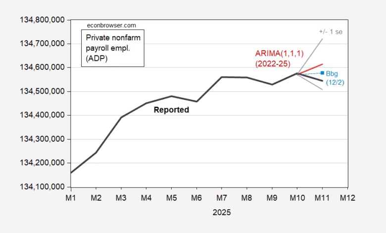 Figure 1: ADP private nonfarm payroll employment, November release (bold black), ARIMA(1,1,1) forecast based on 22M01-25M10 (red), +/- 1 std error (gray), Bloomberg consensus of 12/3 (light blue square), all s.a. ARIMA estimated over 2022-2025M10 data. Source: ADP via FRED, Bloomberg, and author’s calculations.