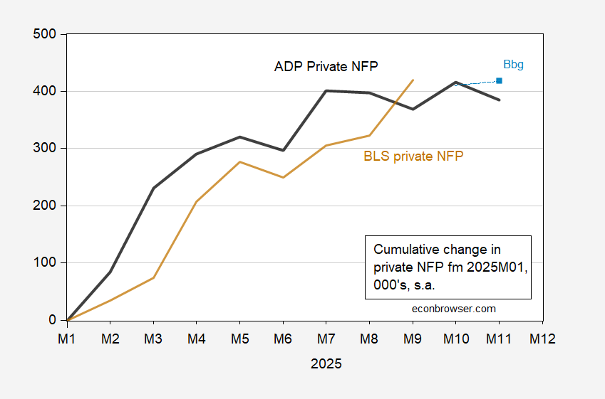 Figure 2: ADP private nonfarm payroll employment, November release (bold black), Bloomberg consensus of 12/3 (light blue square), BLS private nonfarm payroll employment (brown), all s.a. Source: ADP via FRED, Bloomberg, and author’s calculations.