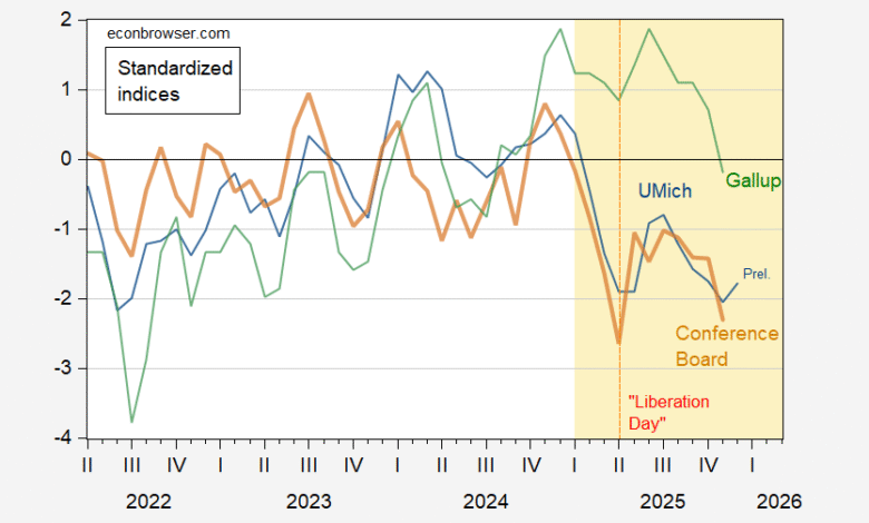 Figure 1: U.Michigan Economic Sentiment (blue), Conference Board Confidence Index (brown), Gallup Confidence (green), all demeaned and divided by standard deviation 2021M01-2025m02. Red dashed line at “Liberation Day” Source: UMichigan, Gallup, Conference Board, and author’s calculations.