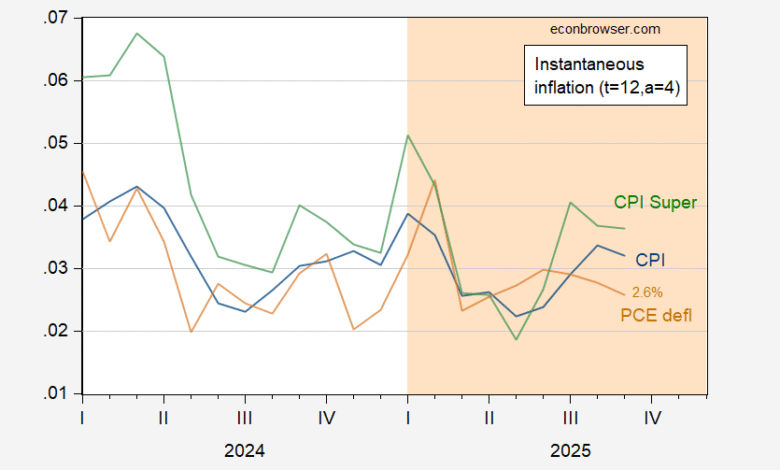 Figure 1: Instantaneous inflation (T=12,a=4) for core CPI (blue), core PCE deflator (brown), supercore CPI (green), all in decimal form %. Calculations per Eeckhout (2023).Source: BLS, BEA, and author’s calculations.