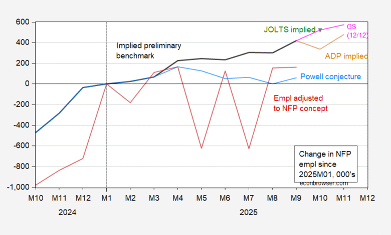 Figure 1: Change in implied benchmark revision since Janaury 2025 (bold black), Goldman Sachs 12/12 (pink), JOLTS implied (inverted green triangle), ADP implied (tan), Powell conjecture (light blue), and CPS employment series adjusted to NFP concept, smoothed population controls (red), all in 000’s. Source: BLS via FRED, Goldman Sachs, ADP, author’s calculations.