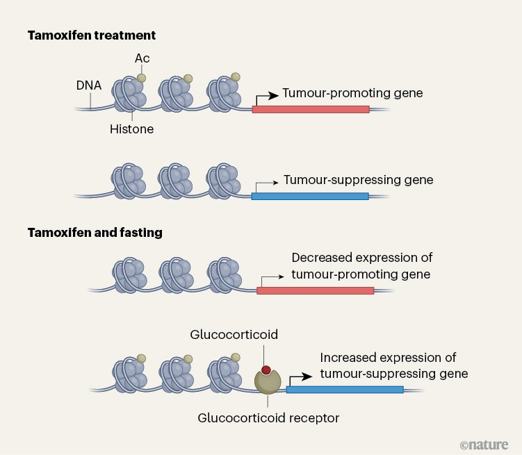 The authors present rigorous studies using several animal models of this type of breast cancer, together with methods to track various molecules in cells (multi-omic approaches). Padrão and colleagues’ findings demonstrate that fasting induces broad reprogramming of ‘epigenetic’ changes — alterations in DNA-binding proteins that modulate gene expression (Fig. 1). These switch on signalling pathways associated with receptors that are activated by the binding of hormones called glucocorticoids; the pathways suppress cell division and prevent the development of resistance.