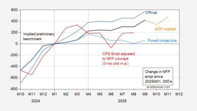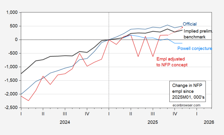 Figure 1: Official CES nonfarm payroll employment (blue), implied benchmark revision (bold black), Powell conjecture based on implied benchmark revision (sky blue), and CPS employment adjusted to NFP concept, smoothed population controls (red), change since January 2025, in 000’s. Source: BLS via FRED, BLS, and author’s calculations.