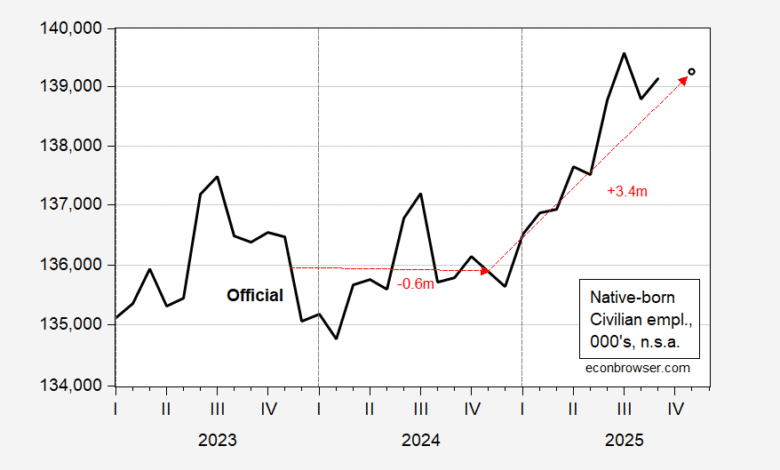 If one looks at Figure 2, without understanding the way in which the civilian employment series is calculated, then one might think there was an “astonishing” jump in employment in Jnauary 2025. The fact is that each year, new population controls are implemented; when the controls differ substantially from the preceding (or succeeding) year, then jumps — that are purely statistical artefacts — can be exhibited. Understanding this debate (which was quite prominent in 2024) induced the BLS to implement on a experimental basis alternative, “smoothed”, population controls. These alternative calculations yield the tan line in Figure 2. As is shown, instead of the +2.6 million increase, one obtains +0.9 million, y/y through November. While Antoni doesn’t cite overall increase, he should understand similar concerns apply to the level of native-born and foreign-born employees. Unfortunately, BLS does not publish an experimental version of the native-born/foreign-born series (to my knowledge). Hence, I estimate the native born level by (1) applying the ratio of native-born to sum of native-born plus foreign-born, and (2) adjusting the sum to reported total civilian employment. Here is the resulting addition to Figure 1.