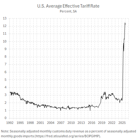 As noted by Jeff Frankel, lots of delay/TACO on the part of Trump meant that the effective tariff rate diverged a lot from the announced rate. Combined with stockpiling, the price effect has been somewhat delayed.