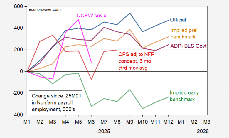 Figure 1: Cumulative change in nonfarm payroll employment from BLS CES-official (blue), implied benchmark release (tan), implied early benchmark (green), from CPS measure adjusted to NFP concept, smoothed population controls, 3 mo centered moving average (red), QCEW total covered seasonally adjusted by author using Census X-13 in logs (pink), and ADP private plus BLS government employment (purple), all in 000’s, s.a. Source: BLS and ADP via FRED, QCEW, Philadelphia Fed, and author’s calculations.