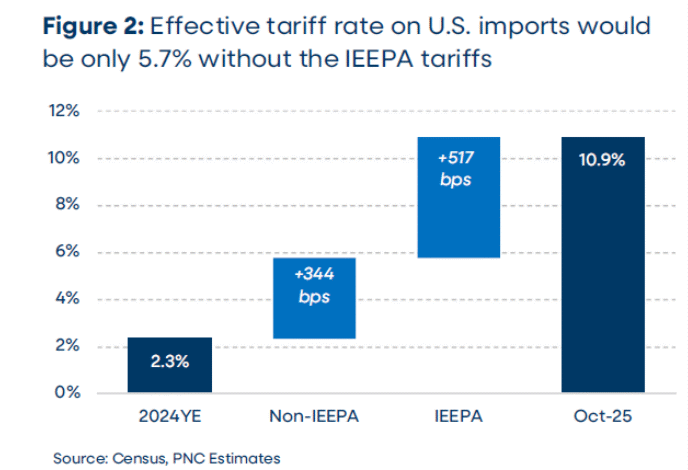 According to PNC Financial Services Economic Research, eliminating the IEEPA tariffs would at least in the short term reduce the realized effective tariff rate: