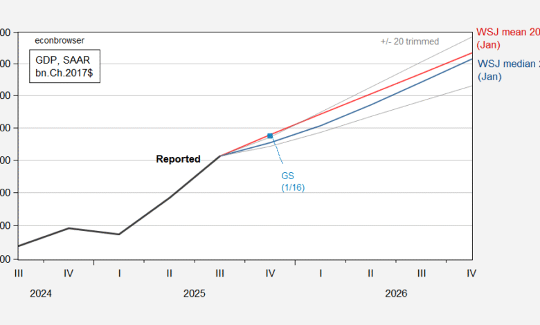 Figure 1: GDP as reported (bold black), WSJ January mean (red), WSJ January median for 2026 (blue), 20% trimmed high/low band (gray lines), and Goldman Sachs 1/16 tracking (light blue square), all in bn.Ch.2017$ SAAR. Source: BEA, WSJ January survey, Goldman Sachs, and author’s calculations.