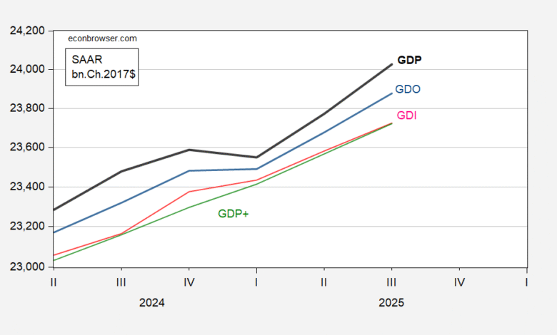 Currently, GDP is 1.3% higher than GDI (in log terms). Historically, on average since 1987, the ratio has been 0.3%. That’s using latest vintage data, rather than real time. Rule of thumb is that using the average of the two series (Gross Domestic Output, arithmetic average of GDP and GDI) has proven a better measure of GDP in the sense the revised GDP tends toward initial GDO.