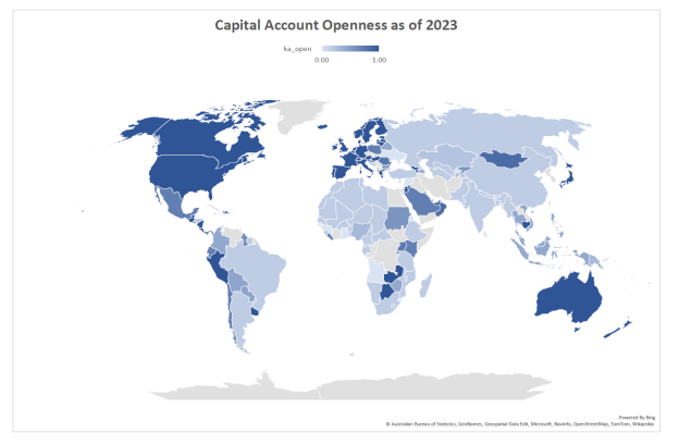 Just published, Chinn-Ito index, available here. Normalized to [0,1], with 1 being most open, here’s the world.