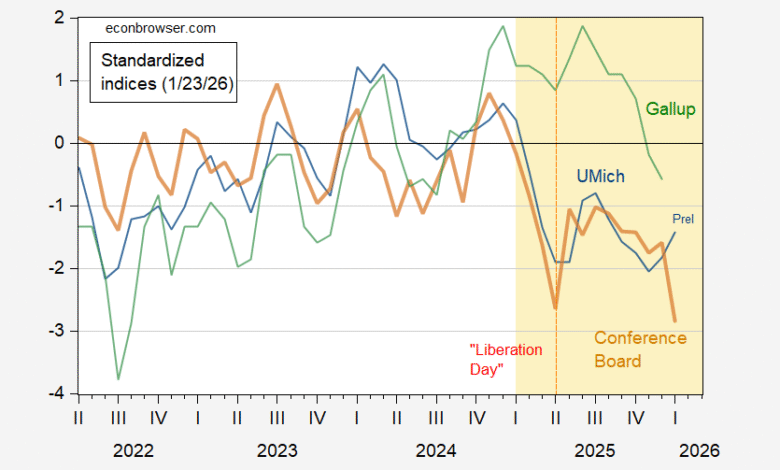 Figure 1: U.Michigan Economic Sentiment (blue), Conference Board Confidence Index (brown), Gallup Confidence (green), all demeaned and divided by standard deviation 2021M01-2025m02. Red dashed line at “Liberation Day” Source: UMichigan, Gallup, Conference Board, and author’s calculations.