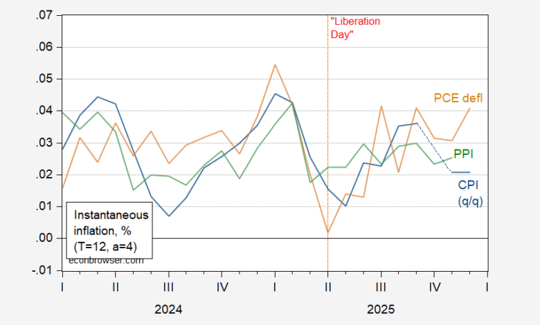 Figure 1: Instantaneous inflation (T=12,a=4) for PPI (green), PCE deflator (brown), q/q annualized CPI (blue), all in decimal form %. Calculations per Eeckhout (2023).Source: BLS, BEA, and author’s calculations.