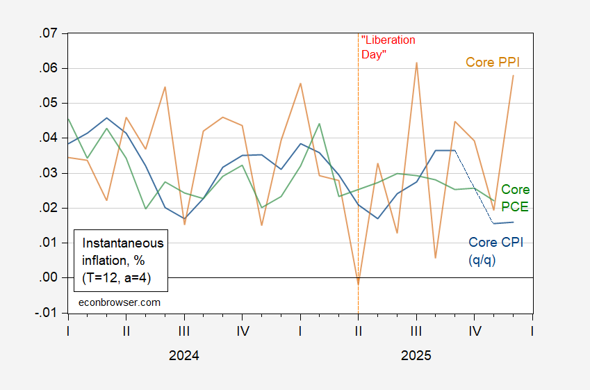 Figure 2: Instantaneous inflation (T=12,a=4) for core PPI (green), core PCE deflator (brown), q/q annualized core CPI (blue), all in decimal form %. Calculations per Eeckhout (2023).Source: BLS, BEA, and author’s calculations.