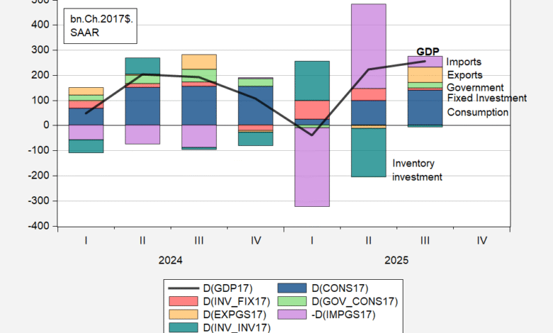 Figure 1: Change in GDP (bold black line), change accounted for by Consumption (dark blue bar), Fixed investment (red bar), Inventory investment (teal bar), government consumption and investment (light green bar), exports of goods and services (orange bar) and imports (lilac bar), all in bn.Ch.2017$ SAAR. Source: BEA 2025Q3 updated release, and author’s calculations.