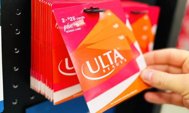 hand taking an ulta gift card from display at sams club