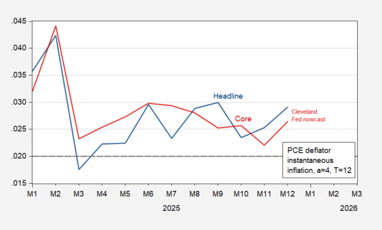 Figure 1: Instantaneous inflation (T=12,a=4) for PCE (blue), core PCE deflator (red), all in decimal form %. December observations are nowcasts as of 2/13 from Cleveland Fed. Calculations per Eeckhout (2023).Source: BEA, Cleveland Fed, and author’s calculations.
