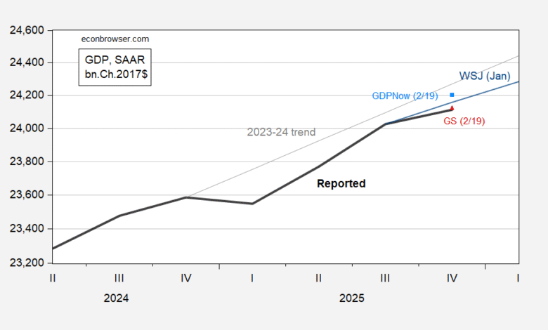 Visually, advance reported q/q AR sales growth of 2.4% seems to have largely have hit the mark, in accord with the view that it’s easier to predict these domestic components. However, growth was below GDPNow’s 2.6% nowcast (but roughly at GS’s). Recession in 2025Q4 seems highly unlikely given what we’ve seen thus far. Nowcasts for 2026Q1 range from 2.7% (NY Fed) to 3.1 (Atlanta Fed).